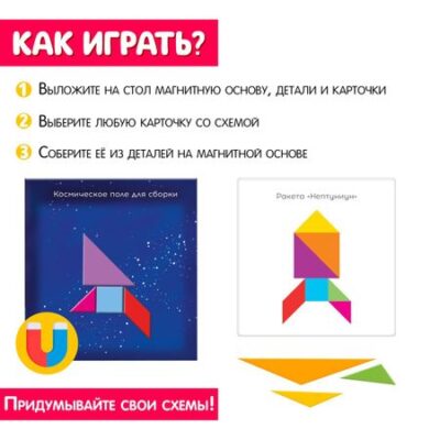 Магнитный танграм в книжке «Космос». Танграм — одна из самых популярных в мире головоломок. Собирать ее интересно взрослым и детям! Танграм «Космос» включает в себя 8 геометрических магнитных фигур и схемы для сборки. Попросите ребенка собрать множество силуэтов: далекую звезду, астронавта на Луне, ракету. Игра способствует развитию познавательных способностей, мелкой моторики, памяти, внимания и кругозора. Рекомендовано детям старше 3 лет. <b> Отправляйтесь с малышом на поиски космических приключений!</b>