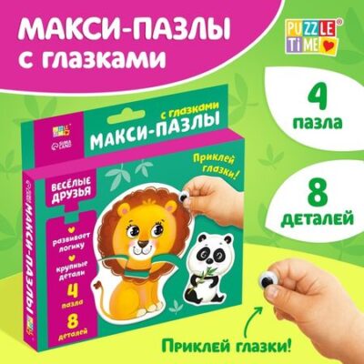 Макси-пазлы с глазками «Весёлые друзья» — это 8 деталей, из которых ребёнок соберёт 4 разных пазла и познакомится с животными. Макси пазлы помогут развить усидчивость, координацию и мелкую моторику рук, а также научат находить связь между частью и целым.Ваш ребёнок не останется равнодушным к объёмным деталям пазла. Яркие картинки поднимут настроение и надолго привлекут внимание малыша, а также поспособствуют развитию цветового и зрительного восприятия, внимательности и логического мышления.