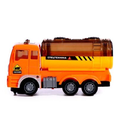 Машина «Топливо», световые и звуковые эффекты, работает от батареек. Машина «Топливо» — это отличный подарок для детей от 3 лет. Эта замечательная машинка станет любимой игрушкой малыша благодаря яркому дизайну. Игрушка создана по прототипу реального автомобиля и имеет проработанные элементы. Поэтому малыш увлекательно проведет время за игрой и познакомится с новым видом транспорта. <b> Особенности</b> <ul> <li> Машинка умеет разворачиваться.</li> <li> Световые эффекты: горят лампочки на кабине машины и в цистерне.</li> <li> Звуковые эффекты: машинка воспроизводит звуки работающего мотора, сигнала, а также одну мелодию.</li> <li> Игрушка работает от 2 батареек типа АА (не входят в комплект).</li> </ul> <b> Играем с пользой:</b> Машина «Топливо» — это не просто игрушка, а проработанная модель реального автомобиля, которая поможет ребенку: <ul> <li> познакомиться со специальной техникой,</li> <li> развить мелкую моторику рук,</li> <li> развить воображение и придумывать новые сюжеты для игр,</li> <li> потренировать пространственное мышление.</li> </ul>