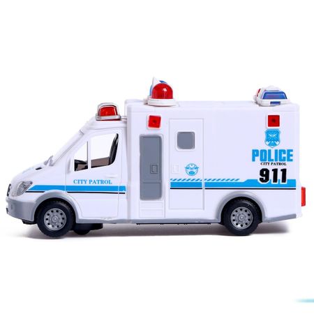 Машина «Полиция», открываются двери, световые и звуковые эффекты, работает от батареек. Для ребенка, желающего стать настоящим героем, требуется спецтранспорт. С игрушкой малыш с удовольствием увлечется важной миссией и узнает много нового о профессии полицейского. Яркие световые и звуковые эффекты сделают полицейскую машину еще более реалистичной. <b> Особенности машинки</b> <ul> <li> Техника воспроизводит звук сирены.</li> <li> Задние двери открываются.</li> <li> Размер машинки: 20 × 7,7 × 10 см.</li> <li> Световые эффекты — во время игры корпус игрушки светится.</li> <li> Автомобиль самостоятельно ездит в случайные стороны благодаря специальному моторчику.</li> <li> Работает от 3 батареек типоразмера AА (нет в комплекте).</li> <li> Предназначена для детей от 3 лет.</li> </ul>