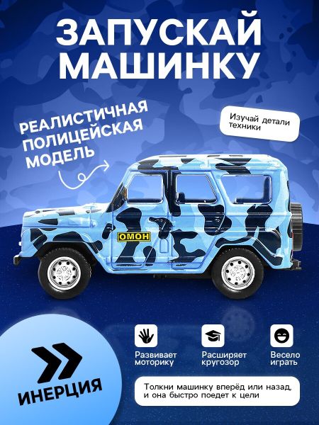 Машина металлическая «УАЗ Hunter. ОМОН», инерция, 1:43. Машина металлическая «УАЗ Hunter. ОМОН» — детально проработанный транспорт. Машинка дополнит игрушечный автопарк и станет прекрасным подарком для маленького любителя техники. <b> Особенности машинки</b> <ul> <li> Кузов выполнен из металла, все остальные элементы из пластика. Детали покрыты безопасной краской.</li> <li> Модель точно детализирована: выштамповка кузова, навесные элементы и др.</li> <li> Встроен инерционный механизм. Привести транспорт в движение не составит труда: необходимо лишь отвести его назад и отпустить. Игрушка быстро наберет скорость и мгновенно достигнет намеченной цели.</li> <li> Масштаб модели — 1:43. Длина — 11,5 см.</li> </ul> <b> Соберите всю коллекцию</b> Линейка металлических автомобилей «Автоград» представлена широким ассортиментом лицензионных современных и ретромоделей: легковые, гоночные, внедорожники. <b> Неоспоримая польза</b> Сюжетно-ролевые игры с игрушечным транспортом способствуют развитию воображения, мышления и эмоционального восприятия. Товар предназначен для детей старше 3 лет.