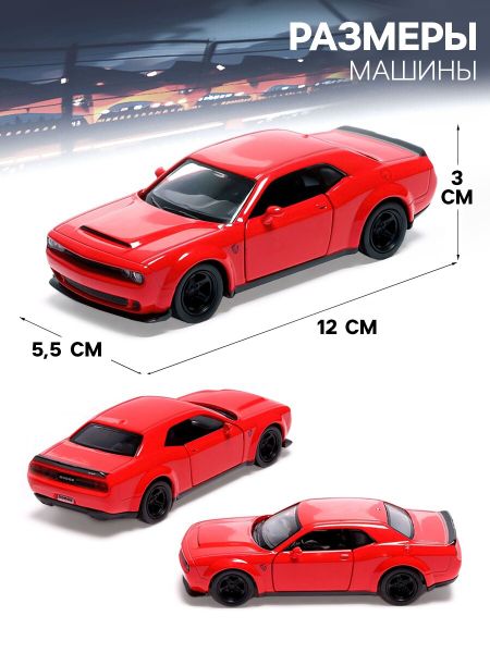 Машина металлическая DODGE CHALLENGER SRT DEMON, 1:32, инерция, цвет красный. Коллекционная машина «Автоград» — детально проработанная лицензионная модель. Она дополнит игрушечный автопарк и станет прекрасным подарком для маленького любителя техники. <b> Особенности модели</b> <ul> <li> У машины открываются двери.</li> <li> Колеса прорезиненные.</li> <li> Кузов выполнен из металла. Все остальные элементы из пластика.</li> <li> Модель точно детализирована: выштамповка кузова, навесные элементы и др.</li> <li> Встроен инерционный механизм. Он позволяет задать транспорту скорость и дает возможность двигаться самостоятельно, по инерции.</li> <li> Масштаб модели — 1:32.</li> </ul> <b> Соберите всю коллекцию!</b> Линейка металлических автомобилей «Автоград» представлена широким ассортиментом лицензионных моделей: легковые, гоночные, внедорожники и ретро. <b> Увлекательно и полезно</b> Занимаясь коллекционированием, ребенок научится разбираться в марках и моделях автомобилей, будет развивать интерес к технике и знакомиться с устройством автомобиля.