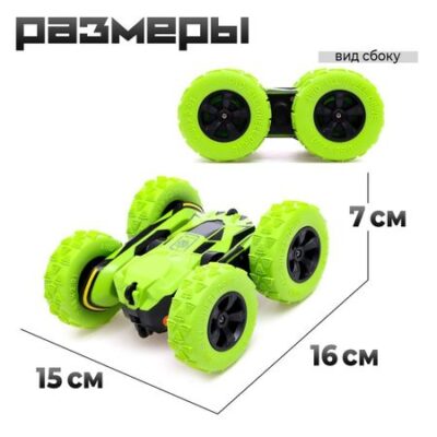 Машина-перевертыш радиоуправляемая «Трюкач», работает от аккумулятора, цвет зеленый. Радиоуправляемая машина-перевертыш «Трюкач» способна подстраиваться под любые дорожные условия! Ее пары колес вращаются независимо от корпуса, что позволяет легко преодолевать препятствия. <b> Особенности радиоуправляемой машинки-перевертыша</b> <ul> <li> «Трюкач» невозможно перевернуть, чтобы он не смог дальше ехать. Транспорт спроектирован так, что при переворачивании на крышу или бок машина сможет продолжить свой путь.</li> <li> Пары колес крутятся независимо от кузова машины.</li> <li> Колеса резиновые, что обеспечивает хорошее сцепление с дорогой.</li> <li> Развивает скорость до 14 км/ч.</li> <li> Без задержки реагирует на все команды с пульта.</li> <li> Вы сможете контролировать точные движения техники вперед, назад, вправо, влево, а также делать развороты на 360֯.</li> <li> Машина работает от аккумулятора 4,8 В 700 мА∙ч (в комплекте). Провод для зарядки в комплекте.</li> <li> Время работы от полностью заряженного аккумулятора: 30 минут.</li> <li> Время зарядки аккумулятора: 80 минут.</li> <li> Дальность действия пульта: 50 м. Работает от 2 батареек типоразмера AA (нет в комплекте).</li> </ul>