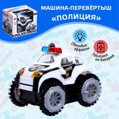 Машина-перевертыш «Полиция», работает от батареек, световые эффекты. Яркий акробат среди машинок! Самоходная машинка-перевертыш «Полиция» — это динамичная игрушка с эффектными световыми сигналами. Машинка умеет переворачиваться, продолжая движение, и моментально привлекает внимание детей реалистичным дизайном и функциональностью. <ul> <li> Эффектные световые сигналы: мигающие огни создают атмосферу настоящей полицейской погони. Ребенок почувствует себя участником захватывающего приключения.</li> <li> Автоматическое переворачивание: машинка легко кувыркается при столкновении с препятствиями и продолжает ехать. Это делает игру непредсказуемой и веселой.</li> <li> Прочная и безопасная конструкция: корпус из качественного пластика выдерживает активные игры.</li> <li> Работает от 2 батареек типа АА. Просто вставьте их — и машинка готова к действию.</li> </ul> Почему детям понравится: эта машинка сочетает в себе реалистичный дизайн полицейского внедорожника и необычные функции. Световые эффекты и способность переворачиваться делают ее одной из самых интересных игрушек в коллекции.