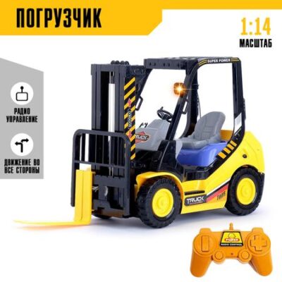 Машина радиоуправляемая «Погрузчик», работает от аккумулятора, свет. Радиоуправляемый погрузчик станет незаменимой техникой в гараже каждого юного строителя. Он оборудован вилами для транспортировки крупногабаритных и тяжелых грузов. <b> Функциональные особенности</b> <ul> <li> Световые эффекты: во время игры загораются проблесковые маячки;</li> <li> Движение вил: вверх-вниз.</li> </ul> <b> В комплект входит:</b> <ul> <li> погрузчик;</li> <li> поддон (10,5 × 10,5 × 1,5 см);</li> <li> бочка (6 × 6 × 9 см);</li> <li> пульт управления;</li> <li> аккумулятор;</li> <li> 2 батарейки типа АА;</li> <li> блок питания.</li> </ul> Для детей старше 3 лет.