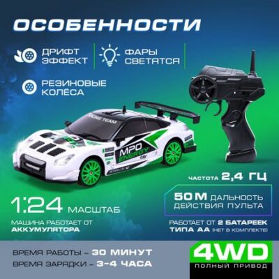 Машина радиоуправляемая «Японский дрифт», дрифт эффект, сменные колеса, работает от аккумулятора. Радиоуправляемая машина «Японский дрифт» способна мастерски заходить в управляемые заносы и эффектно проходить повороты. С таким транспортом вы будете королем всех извилистых гоночных треков! <b> Особенности радиоуправляемой машинки</b> <ul> <li> Без задержки реагирует на все команды с пульта: вы сможете контролировать точные движения техники вперед, назад, вправо, влево.</li> <li> Машина развивает скорость до 15 км/ч.</li> <li> Время работы: 20–30 минут.</li> <li> Машина работает от аккумулятора 3,7 В 500 мА∙ч (в комплекте).</li> <li> Время зарядки аккумулятора: 3–4 часа.</li> <li> Дальность действия пульта: 50 м. Пульт работает от 2 батареек типоразмера AA (нет в комплекте).</li> <li> Светятся фары.</li> <li> Есть второй комплект колес.</li> <li> В набор входят конусы, чтобы выстроить трассу.</li> <li> Вы можете приобрести две машинки и играть с друзьями. Наборы не конфликтуют при одновременном использовании.</li> </ul> <b> В комплекте:</b> <ul> <li> дрифт-машина;</li> <li> пульт-пистолет;</li> <li> колеса — 2 комплекта;</li> <li> конусы — 6 шт.;</li> <li> аккумулятор — 3,7 В 500 мА∙ч;</li> <li> USB-кабель для зарядки.</li> </ul>