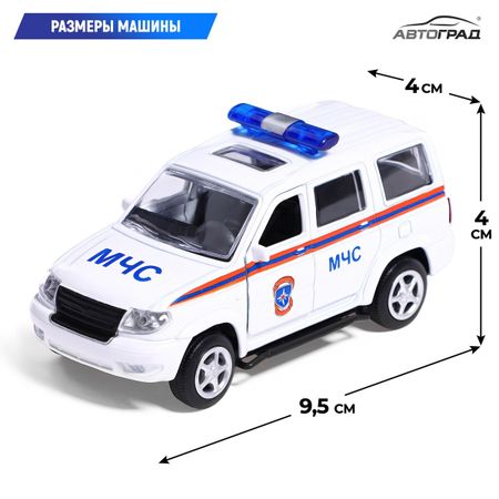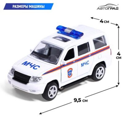 Машинка металлическая «УАЗ Патриот. МЧС», инерция, 1:50. Металлическая машинка «УАЗ Патриот. МЧС» во главе с малышом уже мчится на спасение мирных жителей! Реалистичная металлическая модель покорит любые дороги, будь то ковер в гостиной или песочница во дворе. Прочный металлический корпус выдержит любые испытания. Эта инерционная машинка станет настоящим сокровищем в коллекции вашего ребенка. <b> Особенности:</b> <ul> <li> Масштаб машинки — 1:50.</li> <li> Инерционный механизм движения. Привести транспорт в движение не составит труда: необходимо лишь отвести машинку назад и отпустить. Игрушка быстро наберет скорость и мгновенно достигнет намеченной цели.</li> <li> У машинки открываются передние двери.</li> </ul> <b> Играем с пользой</b> Машинка «УАЗ Патриот. МЧС» — это не просто игрушка, а инструмент для развития: <ul> <li> мелкой моторики,</li> <li> воображения,</li> <li> сюжетно-ролевой игры,</li> <li> интереса к технике,</li> <li> чувства ответственности и патриотизма.</li> </ul>