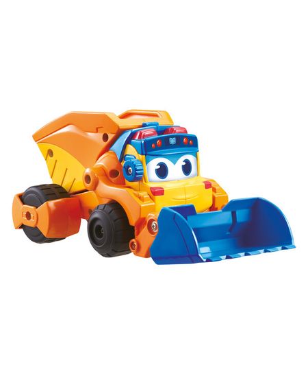 Машина бульдозер с ковшом из серии строительные машины по мотивам мультсериала Команда Steam и Автобус Гордон понравится всем любознательным малышам. У машинки яркий желтый цвет корпуса, синие элементы и ковш, веселая мордочка, а также закругленные безопасные углы и прочные колеса. А если нажать на кнопку, то машина для малышей поменяет выражение глаз. Все машинки строительная техника отличаются высокой износоустойчивостью и оснащены подвижными элементами: трап или кран у грузовика, ковш у бульдозера, подвижные элементы у автобуса др. Если собрать все шесть машинок линейки, то получится не просто отличный набор машинок строительной техники, но и можно будет собрать одного большого робота 33 см! Такая техника украсит и коллекцию других моделей автомобилей и спецтехники. Машинка детская поможет малышу развивать мелкую моторику рук, логическое мышление, воображение и координацию. Детские машинки — отличный подарок для мальчика или девочки на День Рождения, Новый Год, 23 февраля или 8 марта. Эскаватор произведен из качественного прочного пластика без посторонних запахов. Машина игрушка крепкая, надежная и прослужит долго. Детская машинка игрушка рекомендована для детей от 3-х лет. Упакована в прочную картонную коробку с блистером.