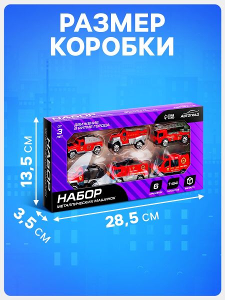 Машинки металлические «Пожарная служба», 6 шт., масштаб 1:64. С набором металлических машин «Пожарная служба» ребенок сможет почувствовать себя настоящим защитником и спасти город от пожара. Благодаря разнообразию машинок маленький герой быстро домчится до места возгорания и справится с любой миссией. Яркий дизайн и проработанные элементы сделают игру реалистичной и интересной. <b> Особенности</b> <ul> <li> Машины «Пожарная служба» предназначены для детей старше 3 лет.</li> <li> Машинки без механизма. Дополнительных функций нет. Поэтому ничто не будет ограничивать фантазию и игровые сюжеты малыша.</li> <li> Игрушки цвета МИКС. Прийти может случайный набор, это позволит сохранить интригу и заинтересовать ребенка.</li> <li> Игра с машинками способствует развитию мелкой моторики, координации движений и пространственного мышления.</li> </ul>