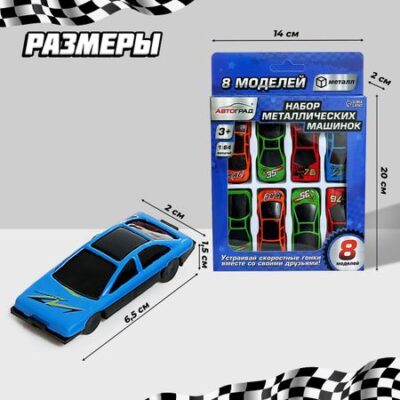 Машинки металлические, набор 8 шт., масштаб 1:64. <strong> Машинки на любой вкус и цвет </strong> Подарите мальчишке возможность почувствовать себя настоящим автоколлекционером. С набором металлических машин малыш выберет себе игрушку по душе. Яркие маленькие автомобили непременно понравятся начинающему гонщику. Сыночку захочется поделиться своими игрушками с друзьями и устроить настоящие соревнования в скорости. Игры с машинками способствуют развитию координации движений ребенка, пространственного мышления, цветового и эмоционального восприятия, мелкой моторики. Размер одной машины: 6,5 × 2 × 1,5 см. Товар предназначен для детей старше 3 лет.