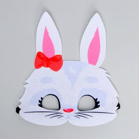 Маска карнавальная «Зайка» с бантиком. Карнавальная маска «Зайка» — милый аксессуар для утренника. Маска также отлично подойдет в качестве простой игрушки, она поможет малышу самостоятельно создать свой первый образ, ведь ее легко надеть и снять. Маска станет хорошим дополнением к подарку на День рождения, Новый год и любые другие праздники! <b> Особенности</b> <ul> <li> Маска небольшая по размеру, поэтому она подойдет для самых маленьких.</li> <li> Карнавальная маска крепится к голове при помощи резинки.</li> <li> Маска сделана из фетра.</li> </ul>