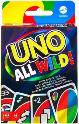 Players can lay down any card in their hand — since every card is a Wild Card, there’s no need pick one that matches a color or number as in classic UNO. Sounds easy, right? Well, it kinda is and the game moves pretty fast, but watch out because special Action Cards can really change the game! There are classic Wild Reverse and Wild Skip cards. But there’s also a Skip 2 card that skips two players! The Wild Swap Hands forces players to exchange hands, and the Wild Targeted Draw 2 lets players choose who must draw.