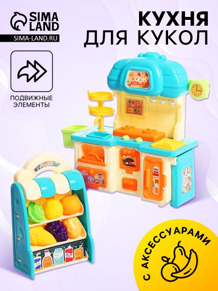 Мебель для кукол «Кухонька», с аксессуарами. Кухонный гарнитур для кукол с подвижными элементами станет отличным дополнением к кукольному домику. Набор включает элементы кухни, которые помогут создать уютное пространство для игр с куклами. Этот миниатюрный комплект идеально подойдет для маленьких хозяек, которые хотят обустроить свою игрушечную кухню. <b> Особенности</b> <ul> <li> Комплект включает стеллаж и кухонный гарнитур с раковиной и плитой.</li> <li> Подходит для кукольных домиков благодаря компактным размерам.</li> <li> Изготовлен из прочного и безопасного пластика.</li> <li> Элементы выполнены в приятных бежево-голубых тонах и гармонично впишутся в интерьер кукольного домика.</li> <li> Предназначен для детей от 3 лет.</li> </ul> <b> Играть в куклы — полезно</b> Игрушечная кухня позволяет ребенку создать множество игровых сценариев: приготовление обеда для кукол, организация ужина или уборка кухни. Такие игры развивают фантазию и социальные навыки, помогают детям осваивать ролевые модели и учиться взаимодействовать.