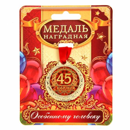 Медаль юбилейная «С юбилеем 45», d=4 см. Изделие — хороший подарок и отличная награда для именинника! Ее яркий дизайн будет долгое время радовать владельца и привлекать к нему заслуженное внимание! Лента в комплекте позволит незамедлительно использовать аксессуар по назначению. Металлическая медаль с гравировкой на обороте преподносится на красочной подложке с европетлей. Такой подарок придется по душе каждому!