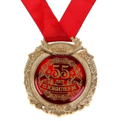 Медаль юбилейная в бархатной коробке «С юбилеем 55 лет», d= 6,5 см.. Создана формула идеального поздравления: классическая форма и праздничное содержание. Именно такой и является медаль юбилейная в бархатной коробке «С юбилеем 55 лет», d= 6,5 см.. Это отличная награда для самых достойных представителей своего времени. Эксклюзивный сувенир станет достойным украшением вечера и поможет создать незабываемую церемонию поздравления. Медаль изготовлена из фигурного металла золотистого цвета, декорирована цветной вставкой с акриловым покрытием, что предотвращает ее потускнение. Награда упакована в бархатную подарочную коробку, идет в комплекте с лентой.