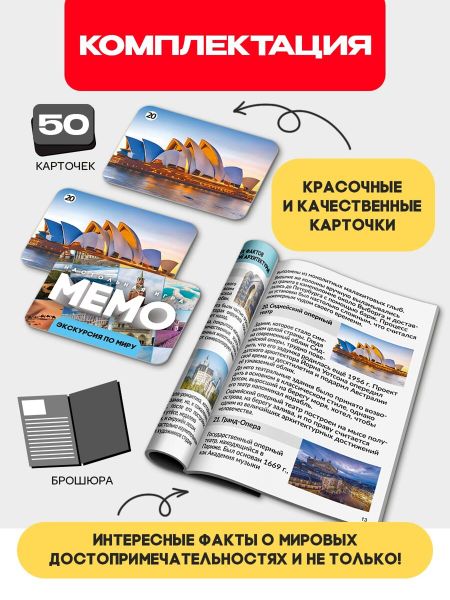 Мемо «Экскурсия по миру. Шедевры архитектуры», 50 карточек, 2 игрока, 5+. <b> Откройте мир архитектурных шедевров через увлекательную игру!</b> Мемо «Экскурсия по миру. Шедевры архитектуры» — это настольная игра, которая сочетает в себе развлечение и обучение. Соберите пары карточек с изображениями знаменитых архитектурных достопримечательностей, тренируя память и расширяя кругозор. Игра подходит для двух участников и станет отличным способом провести время с пользой. <b> Особенности</b> <ul> <li> 50 карточек с шедеврами архитектуры — в набор входят яркие и качественные изображения самых известных зданий и сооружений со всего мира.</li> <li> Развитие памяти и внимания — игра помогает улучшить концентрацию, тренирует зрительную память и способность быстро запоминать информацию.</li> <li> Правила игры понятны даже ребенку от 5 лет. Найдите парные карточки, запоминая их расположение, и соберите как можно больше пар. Это отличный способ провести время в кругу семьи или с друзьями.</li> </ul> Мемо «Экскурсия по миру. Шедевры архитектуры» это не просто игра, а возможность узнать что-то новое, развить важные навыки и провести время с удовольствием. Погрузитесь в мир архитектуры и откройте для себя новые горизонты!
