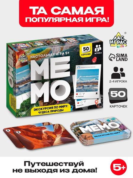 Откройте мир чудес природы через увлекательную игру!Мемо «Экскурсия по миру. Чудеса природы» — это настольная игра, которая сочетает в себе развлечение и обучение. Соберите пары карточек с изображениями природных чудес, тренируя память и расширяя кругозор. Игра подходит для двух участников и станет отличным способом провести время с пользой.Особенности50 карточек с чудесами природы — в набор входят яркие и качественные изображения самых удивительных и красивых мест со всего мира.Развитие памяти и внимания — игра помогает улучшить концентрацию, тренирует зрительную память и способность быстро запоминать информацию.Правила игры понятны даже ребёнку от 5 лет. Найдите парные карточки, запоминая их расположение, и соберите как можно больше пар. Это отличный способ провести время в кругу семьи или с друзьями.Мемо «Экскурсия по миру. Чудеса природы» это не просто игра, а возможность узнать что-то новое, развить важные навыки и провести время с удовольствием. Погрузитесь в мир природы и откройте для себя новые горизонты!