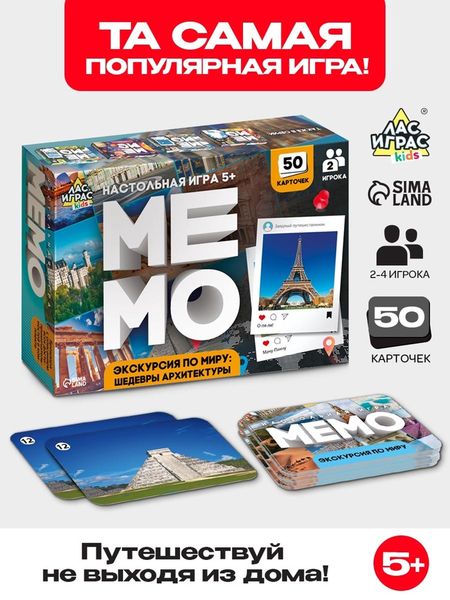 Откройте мир архитектурных шедевров через увлекательную игру!Мемо «Экскурсия по миру. Шедевры архитектуры» — это настольная игра, которая сочетает в себе развлечение и обучение. Соберите пары карточек с изображениями знаменитых архитектурных достопримечательностей, тренируя память и расширяя кругозор. Игра подходит для двух участников и станет отличным способом провести время с пользой.Особенности50 карточек с шедеврами архитектуры — в набор входят яркие и качественные изображения самых известных зданий и сооружений со всего мира.Развитие памяти и внимания — игра помогает улучшить концентрацию, тренирует зрительную память и способность быстро запоминать информацию.Правила игры понятны даже ребёнку от 5 лет. Найдите парные карточки, запоминая их расположение, и соберите как можно больше пар. Это отличный способ провести время в кругу семьи или с друзьями.Мемо «Экскурсия по миру. Шедевры архитектуры» это не просто игра, а возможность узнать что-то новое, развить важные навыки и провести время с удовольствием. Погрузитесь в мир архитектуры и откройте для себя новые горизонты!