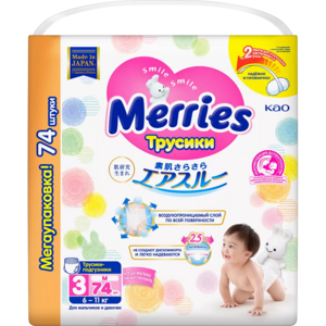 Трусики Merries изготовлены из чистого хлопка, гладкого как шёлк и очень мягкого на ощупь. Вся поверхность трусиков-подгузников Merries пропускает испарения и позволяет коже ребенка дышать. Даже во время активных игр попка малыша в них все время сухая. Кроме того, пояс трусиков Merries сделан таким образом, что испарения уходят вверх. Мягкий пояс и резиночки вокруг ножек нежно облегают животик и ножки малыша 24 часа в сутки, обеспечивая ему полную свободу движений, даже когда он кушает, играет или спит. Пунктирная резинка крепко удерживает трусики на поясе ребёнка, как бы он не двигался. У трусиков есть специальный поглощающий слой, который трансформируется со всех сторон. Поглощающий слой имет специальный разрез, вдоль которого идёт впитывание, благодаря чему трусики не разбухают между ножек, подстраиваются под активного малыша и не мешают ему двигаться. Индикатор наполняемости всегда подскажет когда следует заменить трусики: если 3 полоски посередине станут синими, то трусики пора менять.