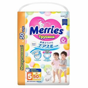 Дышащие трусики Merries идеально подойдут малышу, который начинает активно двигаться. Даже если малыш очень активный, трусики-подгузники Merries надежно защищают от протеканий и опрелостей, обеспечивая необходимый комфорт и свободу движений!Крой трусиков Merries разработан с учетом анатомических особенностей малыша:Хорошо сидят на талии и не сползают, но при этом не жмут и не оставляют следов на нежной коже малыша.Отлично облегают попку, сохраняют форму и заботятся о комфорте малыша, даже когда трусики уже наполнены.Комфортно садятся в паховой области и не создают дискомфорта между ножек.Нежно облегают ножки, не образуют щелей и защищая от протекания.Merries заботится о коже вашего ребенка!Дышащая поверхность вокруг талии отлично выводит испарения, и кожа малыша остается сухой.Испарения в области пояса уходят вверх через воздушные каналы между резинкой и кожей.Дышащий внешний слой.Вся поверхность подгузника изготовлена из воздухопроницаемого материала, который надежно удерживает влагу, но выводит испарения по всей поверхности, оставляя попку сухой.Надежный впитывающий внутренний слой.Благодаря блочной структуре впитывающего слоя трусики впитывают большой объем жидкости, не увеличиваясь значительно в размерах и не мешая движениям малыша.Мягкий эластичный пояс не давит на животик и не оставляет следов.Растягивается в 2,5 раза, что позволяет легко сменить трусики, даже когда малыш лежит.Воздушный и шелковистый внутренний слой понравится даже самой нежной коже.Мягкая поверхность приятна на ощупь и защищает кожу от натирания.Мягкий боковой шов не натирает и не жмет.Инновационный ультразвуковой метод соединения боковых швов делает шов более мягким, а разрывать его теперь ещё легче.Оборочки вокруг ножек предотвращают протекание.Плотно облегают ножки и отлично держатся даже на подвижном ребенке.Индикатор наполнения.Если две центральные полоски индикатора окрасились в голубой цвет — значит, пора менять трусики.Лента для утилизации.Удобно свернуть в трубочку и закрепить использованные трусики лентой для утилизации.Симпатичный дизайн с зайкой Merries подарит малышу хорошее настроение.Подходит для мальчиков и девочек.Впитывающий слой располагается по всей поверхности трусиков-подгузников, поэтому трусики подходят и мальчикам, и девочкам.