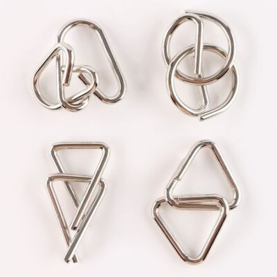Металлические головоломки «Вразумин», набор 4 шт.. Металлические головоломки «Вразумин» — это увлекательный набор для любителей логических задач. В комплекте представлены различные головоломки с кольцами и замками, которые заставят размышлять, анализировать и находить нестандартные решения. Такой формат отлично подходит как для детей, так и для взрослых, ведь тренировка ума полезна в любом возрасте. <b> Особенности набора</b> <ul> <li> 4 головоломки разного типа и сложности.</li> <li> Металлические детали обеспечивают долговечность и надежность.</li> <li> Компактный формат позволяет играть в любом месте — дома, на отдыхе, в дороге.</li> </ul> <b> Развитие через игру</b> Разгадывание головоломок помогает улучшить логическое мышление, концентрацию и мелкую моторику. Каждая задача требует внимательности и терпения, что делает процесс решения особенно увлекательным. Набор головоломок — это не просто игрушка, а отличный инструмент для развития мышления и навыков решения задач.