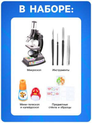 Микроскоп с мини-телескопом и калейдоскоп с набором для исследований, Фиксики. Набор юного исследователя «Фиксики» — микроскоп с увеличением до 900x, мини-телескоп и калейдоскоп в одном комплекте! 14 предметов для первых открытий. <ul> <li> Мощный микроскоп — рассматривайте клетки растений и другие мелкие объекты с увеличением от 100 до 900 крат.</li> <li> Мини-телескоп — наблюдайте за удаленными предметами.</li> <li> Волшебный калейдоскоп — создавайте красочные узоры.</li> <li> Подсветка — встроенная лампа для лучшего обзора.</li> <li> Полный набор — 14 предметов для исследований в комплекте.</li> </ul> Идеальный подарок для любознательных детей от 3 лет! Развивает наблюдательность, интерес к науке и окружающему миру.