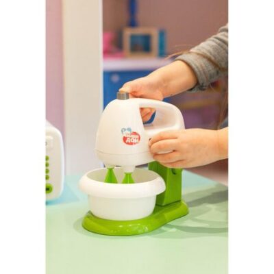 Миксер «Мини-дом», свет, венчики вращаются. Каждая малышка мечтает быть как мама: хозяйственной, аккуратной и трудолюбивой. На кухне маленькой хозяюшке не обойтись без современной бытовой техники, поэтому от этого миксера она будет в восторге! С ним ребенок придумает множество увлекательных сюжетно-ролевых игр. Игрушка упакована в красочную коробочку, поэтому ее можно вручить в подарок даже без дополнительного праздничного оформления. <b> Подробнее об игрушке</b> <ul> <li> Высота миксера — 20 см.</li> <li> Венчики вращаются.</li> <li> При включении миксера загорается лампочка.</li> <li> На миксере находятся 2 кнопки: для включения и выключения (сбоку) и декоративная (сверху).</li> <li> Верхняя часть снимается и миксер становится ручным! Для этого достаточно нажать на зеленую кнопку (находится на корпусе подставки) с двух сторон.</li> <li> Миску можно снять с подставки и играть отдельно.</li> <li> Работает от 2 батареек размера АА (в комплект не входят).</li> </ul> <b> Играем с пользой</b> Этот набор станет не только основой для увлекательной игры, но и познакомит девочку с работой бытовой техники, разовьет кругозор и воображение.