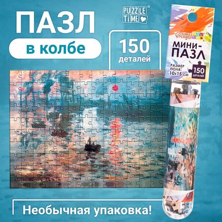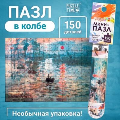 Мини-пазлы в колбе «Восход солнца» – это увлекательная головоломка с репродукцией мировых шедевров живописи. Собирайте удивительные картины всей семьёй и погружайтесь в загадочный мир искусства!Когда соберёте все 150 деталей в одно целое, вы получите красочную картинку размером 15 × 10 см. Детали пазла удобно хранить в пластиковой колбе.Польза собирания пазлов:Развивают память и когнитивные способности.Подбирая деталь и по цвету, и по форме, мы обеспечиваем тренировку взаимодействия правого и левого полушария головного мозга.Тренирует усидчивость и мелкую моторику рук.Как сохранить собранный пазлНанесите клей для пазлов на лицевую сторону получившейся картинки, равномерно распределите его по поверхности.Клей высыхает в течение 1,5−2 часов. После высыхания клей абсолютно прозрачен и не оставляет разводов.Вставьте получившуюся картинку в раму и украсьте интерьер.Пазлы рекомендованы детям от 14 лет.