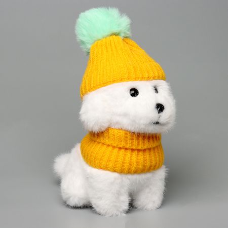 Мягкая игрушка «Собака в желтой шапочке», белая, 20 см. Мягкая игрушка «Белая собака в желтей шапочке» — универсальный презент для ребенка и взрослого. Также может стать хорошим дополнением к интерьеру детской комнаты или использоваться как элемент декора. Изделие выполнено из приятного на ощупь материала. <b> Особенности мягкой игрушки</b> <ul> <li> Верх сшит из мягкого полиэстера.</li> <li> Наполнитель — синтепон.</li> <li> Глазки и носик выполнены из пластика.</li> </ul> <b> Как ухаживать за мягкой игрушкой</b> <ul> <li> Если изделие испачкается, его можно постирать в теплой воде или протереть влажной губкой.</li> <li> Рекомендуем стирать в воде при температуре 30–40 °C в режимах «Деликатная стирка», «Ручная стирка», «Шерсть».</li> <li> После водных процедур игрушку необходимо хорошо просушить, чтобы избежать неприятного запаха затхлости.</li> <li> Не рекомендуем сушить изделие на батарее: от высокой температуры и длительного контакта с горячей поверхностью материал игрушки может испортиться.</li> <li> Если у изделия присутствует мех, после полного высыхания его необходимо расчесать.</li> </ul>
