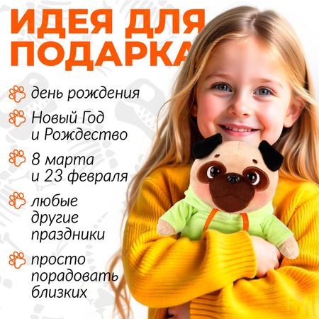 Мягкая игрушка «Боня», в костюме дино. Мягкая игрушка — универсальный презент для ребенка и взрослого. Изделие выполнено из приятного на ощупь материала. <b> Особенности мягкой игрушки</b> <ul> <li> Высота в положении сидя — 23 см, лежа — 32 см.</li> <li> Верх сшит из мягкого полиэстера.</li> <li> Наполнитель — синтепон.</li> <li> Глазки и нос выполнены из пластика.</li> </ul> <b> Как ухаживать за мягкой игрушкой</b> <ul> <li> Если изделие испачкается, его можно постирать в теплой воде или протереть влажной губкой.</li> <li> Рекомендуем стирать в воде при температуре 30–40 °C в режимам «Деликатная стирка», «Ручная стирка», «Шерсть».</li> <li> После водных процедур игрушку необходимо хорошо просушить, чтобы избежать неприятного запаха затхлости.</li> <li> Не рекомендуем сушить изделие на батарее: от высокой температуры и длительного контакта с горячей поверхностью материал игрушки может испортиться.</li> <li> Если у изделия присутствует мех, после полного высыхания его необходимо расчесать.</li> </ul>
