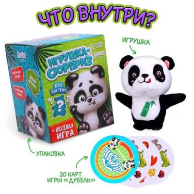 Мягкая игрушка «Панда». <b> Наполенение набора :</b> <li> мягкая игрушка-1 шт,</li> <li> правила игры-1 шт,</li> <li> набор карточек- 1 шт</li> Лучший подарок для малышей — это подарок-сюрприз. Интрига сохраняется до последнего, пока вы не откроете свою заветную коробочку. Собери свою коллекцию игрушек! Что же попадется вам?