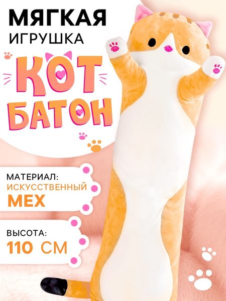 Мягкая игрушка «Рыжий кот-батон» — универсальный презент для ребёнка и взрослого. Изделие выполнено из приятного на ощупь материала. Кот — практичный подарок для детей всех возрастов.Особенности и преимущества игрушки:Наполнитель — синтепон.Верх из мягкого искусственного меха.Высота котика 110 см.Мягкая игрушка станет не только прекрасным подарком, а также отличным украшением спальной комнаты.Как ухаживать за мягкой игрушкойЕсли изделие испачкается, его можно постирать в тёплой воде или протереть влажной губкой.Рекомендуем стирать в воде при температуре 30–40 °C в режимах «Деликатная стирка», «Ручная стирка», «Шерсть».После водных процедур игрушку необходимо хорошо просушить, чтобы избежать неприятного запаха затхлости.Не рекомендуем сушить изделие на батарее: от высокой температуры и длительного контакта с горячей поверхностью материал игрушки может испортиться.Если у изделия присутствует мех, после полного высыхания его необходимо расчесать.