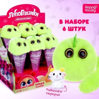 Знакомьтесь, это Пломбир Кэнди-плюш из большой семьи Лупоглазиков.Особенности игрушкиЗверьки выполнены из приятного на ощупь текстиляВысота игрушки — 11 смВ комплект со зверьком входит игрушка-сюрприз из пластикаУпаковка в виде конуса и яркая подставка для 6 игрушек позволяют эффектно подать товар на полках вашего магазина. Также такой набор будет уместным подарком на детских праздникахВнимание!Игрушка представлена в ассортименте, цена указана за 1 игрушку. При оформлении заказа на сайте можно приобрести только 6 игрушек сразу.