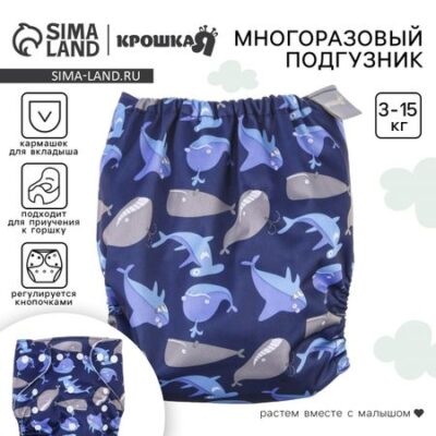 Многоразовый подгузник Крошка Я «Киты», 3-15 кг, синий. • Размер подгузника универсальный, подходит для детей от 3 до 15 кг, от рождения до 3 лет; • Объем по талии и глубина регулируется с помощью кнопок; • Внешний слой выполнен из непромокаемой и дышащей ткани; • Подгузник имеет удобный кармашек для вкладыша; Уход: машинная и ручная стирка при температуре не выше 40°C. Нельзя гладить и сушить на батарее/полотенцесушителе. Не стирать средствами, содержащими мыло. Можно использовать кислородный отбеливатель. Предварительная стирка обязательна.