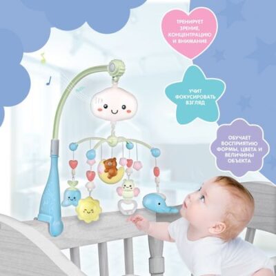 Мобиль музыкальный «Волшебные сны», звук, свет, цвет голубой. Музыкальный мобиль «Волшебные сны» привлечет внимание трогательным дизайном и надолго займет малыша благодаря множеству полезных функций. Игрушка не только развлечет ребенка — с ней можно осваивать новые навыки! Колыбельные песенки успокоят малыша и подготовят его ко сну. Подвижные красочные погремушки и звуки, которые они издают, привлекают внимание малыша. Он с радостью наблюдает за фигурками, пытается дотянуться. Таким образом развивает зрение, внимание, способность концентрироваться на предмете. <b> Особенности игрушки</b> <ul> <li> Мобиль крепится на кроватку с помощью удобного кронштейна.</li> <li> Музыкальный проектор показывает одну картинку — звездное небо. Изображение можно включать и выключать.</li> <li> Игрушка воспроизводит 7 колыбельных песен и 3 спокойные мелодии. Есть регулировка звука и кнопка включения-выключения.</li> <li> Все погремушки съемные, ими можно играть по отдельности. Месяц со световыми эффектами.</li> </ul>