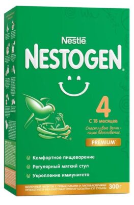 Детское молочко Nestogen 4 было специально разработано для обеспечения сбалансированного здорового питания и комфортного пищеварения малыша. Молочко Nestogen 4 с пребиотиками и уникальными лактобактериями L.reuteri способствует улучшению моторики кишечника, формированию регулярного мягкого стула и становлению здоровой микрофлоры. Здоровая кишечная микрофлора необходима для подержания, развития и укрепления иммунитета. Молочко Nestogen 4 сбалансированный продукт, заменяющий коровье молоко в рационе ребенка старше 18 месяцев. Детское молочко Nestogen 4 дополняет рацион ребенка питательными веществами, необходимыми для его оптимального роста и развития. ВАЖНОЕ ПРИМЕЧАНИЕ Идеальной пищей для грудного ребенка является молоко матери. Продолжайте грудное вскармливание как можно дольше после введения прикорма. Молочко Nestogen 4 предназначено для кормления здоровых детей с 18 месяцев и не является заменителем грудного молока. Продукт изготовлен из сырья, произведенного специально одобренными поставщиками, без использования генетически модифицированных ингредиентов, консервантов и красителей. Примечание: Для сохранения живых бактерий вскипяченную воду следует остудить примерно до температуры тела (37 С) и затем добавить сухой порошок. Для приготовления молочка необходимо использовать мерную ложку, заполненную без горки. Разведение неправильного количества порошка большего или меньшего по сравнению с количеством, указанным в таблице может привести к обезвоживанию организма ребенка или нарушению его питания. Указанные пропорции нельзя изменять без совета медицинского работника.