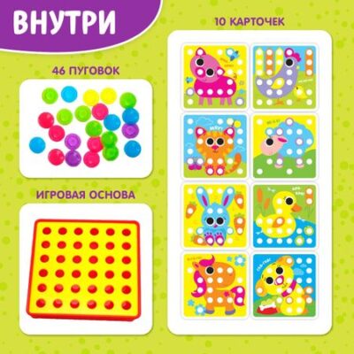 Мозаика детская для малышей «Веселые пуговки. Ферма», 46 крупных пуговок, 10 картинок — шаблонов с животными, 3+. «Веселые пуговки. Ферма» — настольная игра-мозаика для детей от 3 лет. Яркие детали привлекут внимание непоседы и прокачают мелку моторику. В набор также входит брошюра для родителей, в которой вы найдете 10 увлекательных и развивающих игр. <b> Как играть</b> Выберете картинку и заполните карточку подходящими пуговками. Такая игра станет отличным подарком для озорников. Собирая яркую и красочную мозаику малыш познакомиться с удивительными животными. разовьет воображение, логическое мышление и потренирует память.