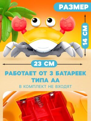 Музыкальная игрушка «Малыш Краби» звук, инерция, оранжевый. Игрушка «Малыш Краби» станет отличным выбором для активных и любознательных малышей. Эта яркая музыкальная игрушка в форме краба оранжевого цвета развлекает детей с самого раннего возраста и стимулирует их развитие. Благодаря инерционному механизму, краб двигается по суше самостоятельно, превращая игру в увлекательное приключение. <b> Особенности</b> <ul> <li> Музыкальное сопровождение делает игру веселой и увлекательной.</li> <li> Инерционное движение — игрушка легко заводится и продолжает двигаться самостоятельно.</li> <li> Прочный пластик обеспечивает долговечность и безопасность.</li> <li> Работает на батарейках типа AA.</li> <li> Рекомендовано для детей от 1 года.</li> </ul> <b> Играем с пользой</b> Игрушка способствует развитию мелкой моторики, координации движений и слухового восприятия. Малыш с интересом будет следить за движениями краба, что помогает развивать зрительное внимание. Веселые песенки создают положительные эмоции и вовлекают ребенка в процесс игры.