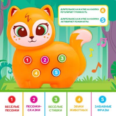 Музыкальная игрушка «Милый дружок: Лисичка». Музыкальная игрушка «Милый дружок: Лисичка» разработана специально для малышей от 12 месяцев. Она привлечет внимание трогательным дизайном и надолго займет малыша благодаря множеству полезных функций. <b> Особенности игрушки</b> <ul> <li> Проигрывает песенки-сказки, звуки животных, веселые песенки, стишки и забавные фразы.</li> <li> Длительное нажатие на кнопку «4» регулирует громкость, на кнопку «5» — активируется режим игры.</li> <li> Кнопочки на туловище зверька мигают и светятся разноцветными огоньками. Можно играть при приглушенном свете.</li> <li> Кнопка включения находится на обратной стороне игрушки, рядом с динамиком и батарейным отсеком.</li> <li> Размер игрушки: 11 × 10 × 3,5 см.</li> <li> Работает от 3 батареек типоразмера AAA (в комплект не входят).</li> </ul> <b> Чем полезны занятия с музыкальной игрушкой</b> Взаимодействуя с игрушкой, малыш тренирует слуховое восприятие, мелкую моторику, координацию движений, мышление и воображение.
