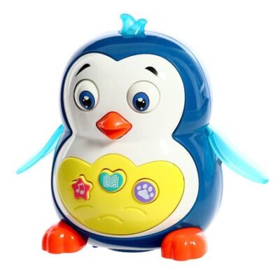 Музыкальная игрушка «Музыкальный пингвиненок», звук, свет. Игрушка «Музыкальный пингвиненок» привлечет внимание трогательным дизайном и надолго займет малыша благодаря множеству полезных функций. Игрушка не только развлечет ребенка — с ней можно осваивать новые навыки! <b> Особенности игрушки</b> <ul> <li> Есть 2 режима игры. В 1-м режиме у пингвиненка светятся крылышки и хохолок, он рассказывает сказки поет веселые песенки.</li> <li> Во 2-м режиме пингвиненок танцует под веселую музыку, а также у него светятся крылышки, двигаются глазки.</li> <li> Есть несколько кнопок, которые отвечают за песенки, сказки, песенки-сказки, регулировку громкости и паузу.</li> <li> Для работы необходимы 3 батарейки типоразмера AA. Батарейки в комплект не входят.</li> </ul> <b> Нажимайте на кнопочку с изображением ноты, и пингвиненок споет веселые песенки:</b> <ol> <li> «Я стою на сцене».</li> <li> «Паровозик».</li> <li> «Лучше места не найдем».</li> <li> «Кошкин дом».</li> <li> «Дождик, дождик».</li> <li> «Раз, два, три».</li> </ol> <b> Нажимайте на кнопочку с изображением книжки, и пингвиненок расскажет сказки:</b> <ol> <li> «Маша и медведь».</li> <li> «Теремок».</li> <li> «Колобок».</li> <li> «Маша и три медведя».</li> <li> «Репка».</li> </ol> <b> Нажимайте на кнопочку с изображением лапки, и пингвиненок споет песенки-сказки:</b> <ol> <li> «Маша и медведь».</li> <li> «Лисичка со скалочкой».</li> <li> «Лиса и волк».</li> <li> «Золотая рыбка».</li> <li> «Заюшкина избушка».</li> <li> «Волк и семеро козлят».</li> </ol> <b> Чем полезны занятия с музыкальной игрушкой</b> Взаимодействуя с пингвиненком, малыш тренирует мелкую моторику, координацию движений, ловкость, мышление и воображение. Рекомендовано детям от 1,5 лет.