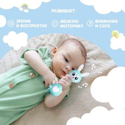 Музыкальная игрушка «Любимый зайчик», звук, свет, цвет голубой. Музыкальная игрушка «Любимый зайчик» привлечет внимание трогательным дизайном и надолго займет малыша благодаря множеству полезных функций. Игрушка не только развлечет ребенка — с ней можно осваивать новые навыки! <b> Особенности игрушки</b> <ul> <li> Воспроизводит песенки.</li> <li> Ушки выполнены из пищевого силикона. Они будут мягко массировать десны и облегчат боль при прорезывании зубов. Такой материал гипоаллергеннен и безопасен для малышей.</li> <li> Есть световые эффекты.</li> <li> Для работы необходимы 3 батарейки типоразмера LR44. Батарейки в комплекте.</li> </ul> <b> Какие песенки воспроизводит игрушка</b> <ol> <li> «Давай с тобой попляшем».</li> <li> «Я в ладошки хлоп».</li> <li> «Скачет зайка, прыг да скок».</li> <li> «Считалочка про зайчика».</li> <li> «Идем гулять».</li> <li> «Мы считаем ножки у сороконожки».</li> </ol> <b> Чем полезны занятия с музыкальной игрушкой</b> Взаимодействуя с игрушкой, малыш тренирует слуховое восприятие, мелкую моторику, координацию движений, ловкость, мышление и воображение. Рекомендовано детям от 1 года.