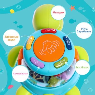 Музыкальная игрушка «Веселая черепаха», звук, свет. Музыкальная игрушка «Веселая черепашка» разработана специально для малышей от 12 месяцев. Она привлечет внимание трогательным дизайном и надолго займет малыша благодаря множеству полезных функций. <b> Особенности игрушки</b> <ul> <li> Воспроизводит мелодии, забавные звуки, ритм барабанов и колыбельную.</li> <li> Колыбельная мелодия оказывает успокаивающее действие на нервную систему малыша, помогает расслабиться и быстро заснуть.</li> <li> Черепашка умеет кататься под звуки и мелодии.</li> <li> Панцирь черепашки светится в темноте.</li> <li> Есть кнопка включения/выключения.</li> <li> Размер игрушки: 12,2 × 15 × 7,5 см.</li> <li> Для работы необходимы 2 батарейки типоразмера AAA. Батарейки входят в комплект.</li> </ul> <b> Чем полезны занятия с музыкальной игрушкой</b> Черепашка стимулирует развитие мелкой моторики, слухового восприятия и воображения.