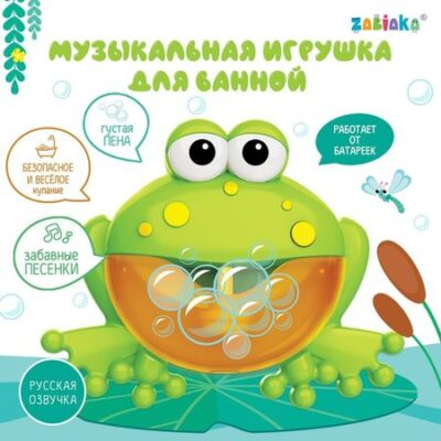 Музыкальная игрушка «Любимый друг: Лягушка» привлечёт внимание трогательным дизайном и поможет сделать водные процедуры веселее.Как игратьОткройте герметичный отсек в корпусе игрушки и установите 2 батарейки типоразмера АА. Батарейки не входят в комплект.Установите продувочное сопло в специальное отверстие.Налейте в контейнер 5 – 10 мл шампуня, геля для душа или другой пенящейся жидкости. Добавьте небольшое количество воды.Закрепите игрушку на стене ванны на присоски и нажмите на кнопку включения. Игрушка начнёт проигрывать весёлые песенки и генерировать большое количество мыльной пены.Малыш услышит 3 песенки:«Мы купаемся».«Светит солнышко».«Знаю танец я простой».Чем полезны занятия с музыкальной игрушкойВзаимодействуя с игрушкой, малыш тренирует мышление и воображение, а также развивает визуальное и слуховое восприятие.Игрушка рекомендована детям от 1 года.