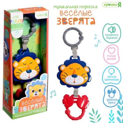 Музыкальная подвеска «Веселые зверята: Лев», ручка для крепления, звук. Музыкальная подвеска «Веселые зверята: Лев» привлечет внимание трогательным дизайном и надолго займет малыша. Красочные подвески и звуки, которые они издают, привлекают внимание малыша. Он с радостью наблюдает за игрушкой, пытается дотянуться. Таким образом развивает зрение, внимание, способность концентрироваться на предмете. <b> Особенности игрушки</b> <ul> <li> Подвеску можно использовать перед сном. Приятные мелодии успокоят малыша и подготовят его ко сну.</li> <li> С помощью крючка игрушка легко крепится на кроватку, коляску или автолюльку, а потом также легко снимается. Удобная ручка позволит малышу самому в любой момент включить мелодии.</li> </ul> Игрушка рекомендована детям от 6 месяцев