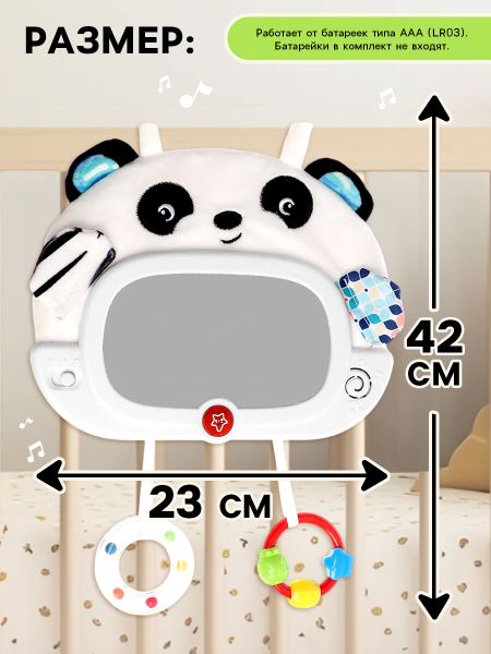 Музыкальная развивающая игрушка «Малышок: Панда», звуковые и световые эффекты. Музыкальная игрушка «Панда» — это замечательный выбор для малышей с 3 месяцев. Она создает уютную атмосферу, развлекает ребенка звуковыми и световыми эффектами, помогая ему изучать окружающий мир. Игрушка идеально подходит для игр дома или в дороге благодаря компактному размеру и универсальности. <b> Особенности</b> <ul> <li> Два режима работы: дневной для активных игр и ночной для спокойного засыпания.</li> <li> Звуки животных и успокаивающие мелодии создают разнообразие и помогают развивать слуховое восприятие.</li> <li> Светящиеся изображения на зеркальце привлекают внимание малыша и стимулируют зрительное восприятие.</li> <li> Погремушки развивают тактильные ощущения и мелкую моторику.</li> <li> Изготовлена из безопасного пластика и текстиля, подходящих для малышей.</li> </ul> <b> Играем с пользой</b> Игрушка помогает развивать слух, зрение и мелкую моторику. Благодаря различным эффектам и фактурам ребенок учится исследовать окружающий мир. «Панда» станет верным помощником в развитии малыша с первых месяцев жизни!