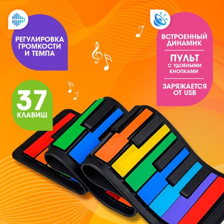 Музыкальное гибкое пианино «Волшебная музыка», 37 клавиш, работает от аккумулятора. Музыкальное пианино привлечет внимание необычным дизайном и надолго займет малыша благодаря множеству полезных функций. Игрушка не только развлечет ребенка — с ней можно осваивать новые навыки! <b> Особенности игрушки</b> <ul> <li> Пианино выполнено из гибкого мягкого материала EVA. Игрушку удобно хранить и брать с собой в дорогу или в гости.</li> <li> Имеет 37 цветных клавиш.</li> <li> Запись и воспроизведение мелодий.</li> <li> Регулировка громкости и темпа.</li> <li> Остановка проигрывания.</li> <li> Для работы необходимы 3 батарейки типоразмера AA. Батарейки в комплект не входят.</li> <li> Инструкция в комплекте.</li> </ul> <b> Чем полезны занятия с музыкальной игрушкой</b> Взаимодействуя с пианино, ребенок тренирует слуховое, визуальное мышление, воображение и моторику пальчиков. Рекомендовано детям от 3 лет.
