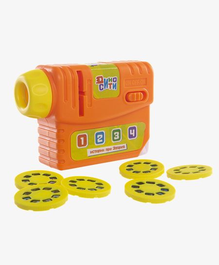 Развивающий музыкальный проектор — 48 проекций из любимого мультфильма ДиноСити. Проектор понравится вашему ребёнку ярким дизайном и функциональностью. Проектор прост в управлении: вставляете диск со слайдами, поворотом диска выбираете изображение, затем вращением линзы настраиваете фокусировку в зависимости от растояния до поверхности, на которую проецируется картинка. Чем темнее будет в помещении, тем ярче получится проецируемое изображение.В проекторе можно не только смотреть изображения из мультфильма, но и слушать истории любимых персонажей и песни. В проекторе записаны 8 фраз персонажей, 2 истории и 1 песня. Проектор также можно использовать как ночник, для этого предусмотрен отдельный режим.Размер: 10,5 х 7 х 3,5 см. Материал: пластмасса + металл. Работает от 3-х батареек типа АА. Рекомендовано детям от 3-х лет.
