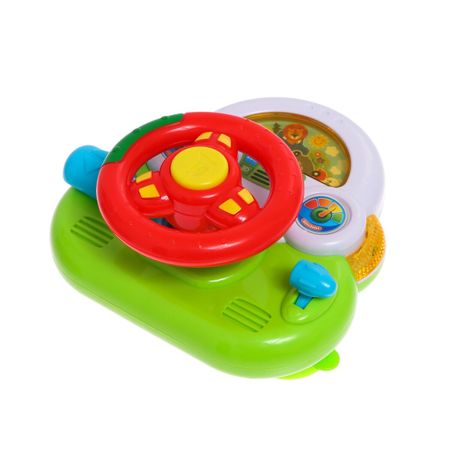 Музыкальный руль «Веселые животные», световые и звуковые эффекты, работает от батареек. Музыкальный руль — идеальный подарок для детей, которые любят представлять себя водителями. Игра с музыкальным рулем разовьет мышление, мелкую моторику, координацию и восприимчивость информации на слух. <b> Особенности игрушки</b> <ul> <li> Эффект движения машинок на циферблате.</li> <li> Рычаг переключения скоростей.</li> <li> Звуки мотора.</li> <li> Звуки клаксона.</li> <li> 7 мелодий.</li> <li> Присоска для фиксации модуля.</li> </ul> Яркий дизайн, звуковые эффекты и мигающие огоньки надолго привлекут внимание малыша.