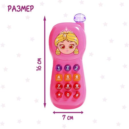 Музыкальный телефон детский «Маленькая принцесса», световые эффекты, русская озвучка, работает от батареек. <em> Веселый телефон для первых игр и обучения!</em> <strong> Музыкальный телефон «Милая принцесса»</strong> — это яркая игрушка со световыми эффектами и русской озвучкой. Малыш познакомится с цифрами, веселыми песенками и звуками, развивая мелкую моторику и слуховое восприятие. <b> Особенности</b> <ul> <li> Телефон помогает запомнить цифры, простой счет и фразы для общения.</li> <li> Ребенок услышит приветствия, звонки и смех — это стимулирует речь и эмоциональное развитие.</li> <li> Мигающий огонек привлекает внимание.</li> <li> Игрушка из прочного пластика выдерживает активные игры.</li> <li> Компактный размер — 16 см — удобен для маленьких рук.</li> <li> Встроенные мелодии и телефонные гудки создают реалистичную атмосферу.</li> <li> Для игры нужны 2 батарейки типа АА (в комплект не входят).</li> </ul> <b> Игрушка воспроизводит веселые фразы</b> <ul> <li> «Привет!».</li> <li> «Как дела?».</li> <li> «Позвони маме».</li> <li> «Позвони папе».</li> <li> «Давай дружить!».</li> <li> «Алло-алло!».</li> </ul> Нажимайте на кнопочки, слушайте забавную мелодию, звуки телефона и весело играйте вместе. Игрушка подходит детям от 3 лет — она станет первым «гаджетом» малыша!