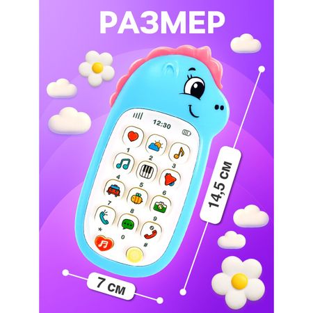 Музыкальный телефон детский «Любимый единорог», звук, цвет голубой. Вместе с милым зверьком кроха разовьет мелкую моторику, память, воображение, мышление, визуальное и слуховое восприятие. Нажимайте на кнопочки телефончика, запоминайте цвета и животных. Расскажите ребенку о цифрах и обучите его счету. Изделие удобно держать в маленькой ручке и нажимать на кнопочки. <b> Малыш услышит 8 песенок:</b> <ul> <li> «Я стою на сцене»,</li> <li> «Знаю танец я простой»,</li> <li> «Учимся считать»,</li> <li> «Я рисую»,</li> <li> «Мы с тобой попляшем»,</li> <li> «Зоопарк»,</li> <li> «Мы играем целый день»,</li> <li> «Колыбельная».</li> </ul> <b> Малыш услышит звуки животных:</b> <ul> <li> свинка,</li> <li> ослик,</li> <li> корова,</li> <li> кошка,</li> <li> курица,</li> <li> лошадь,</li> <li> собачка,</li> <li> коза.</li> </ul>